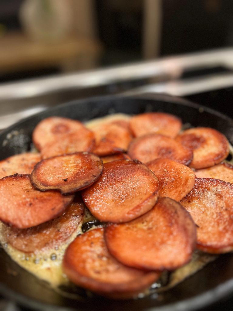 Potatisen gjorde jag genom att koka ratte-potatis nästan helt klart i saltat vatten. Smält sedan smör i en kastrull och stek potatisen runt om. Krydda med vitpeppar. Stäng av värmen och rör ner riven parmesaonsot så det täcker potatisarna. Servera med nymald svartpeppar.
