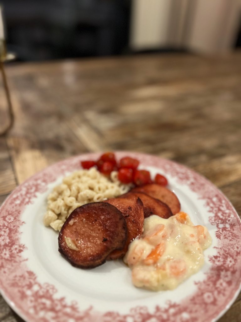 Falukorv, stuvade makaroner, stuvade morötter och tomatsallad. Kan vara en av de godaste vardagsrätterna tycker jag. Men falukorven skall vara tunn och hårt stekt