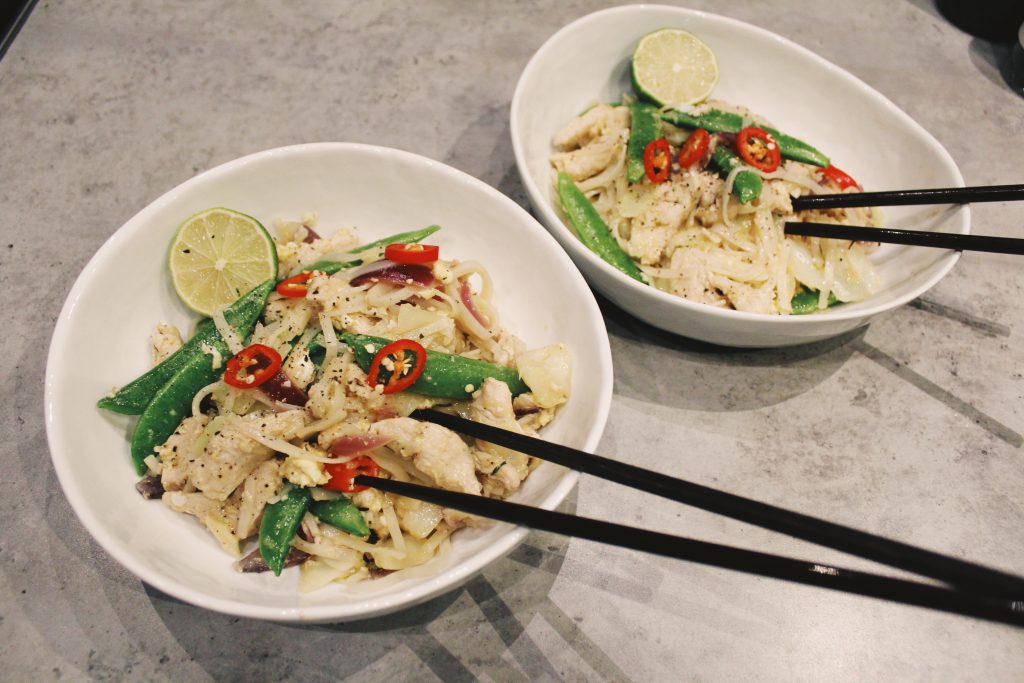 Stek kycklingbitar i olja i en het panna. Tillsätt grönsaker som t ex röd lök, morot, vitkål. När de mjuknat så blanda ner nudlar, sockerärtor och smaksättningen ovan.