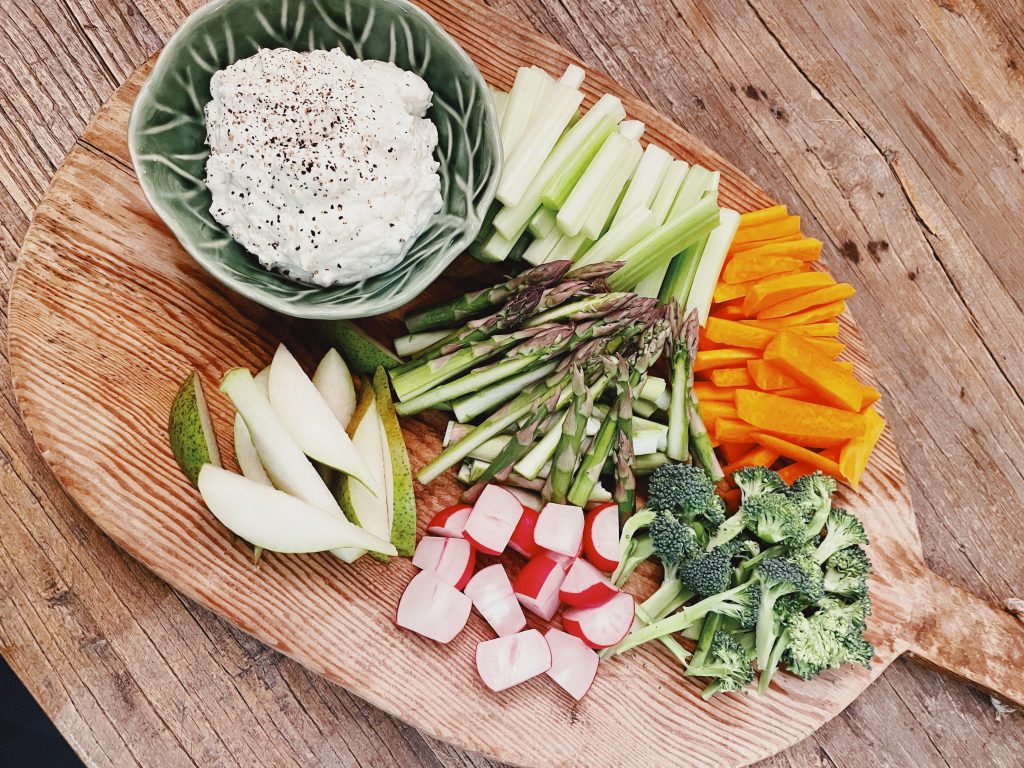 Vi inledde med en plockbricka på grönsaker med en dipp bestående av grekisk yoghurt, lite finhackad schalottenlök, vitlök och finriven pecorino.