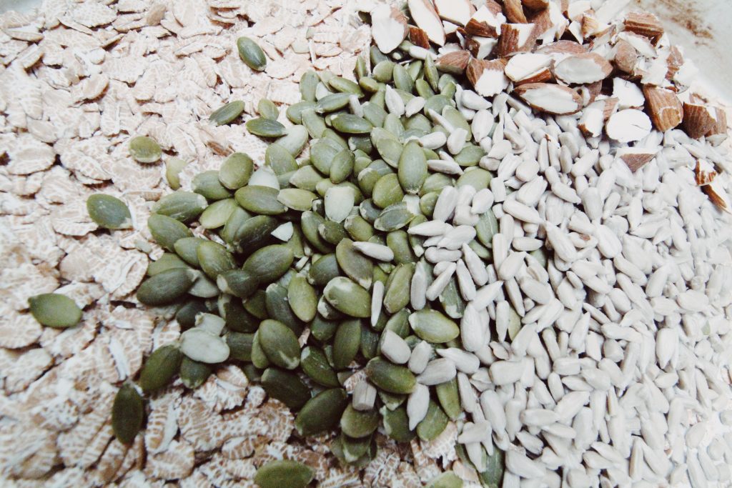 Jag älskar nötter och frön i min granola så jag utgår alltid från lika mycket dinkelgryn som mängd hackade nötter och frön.