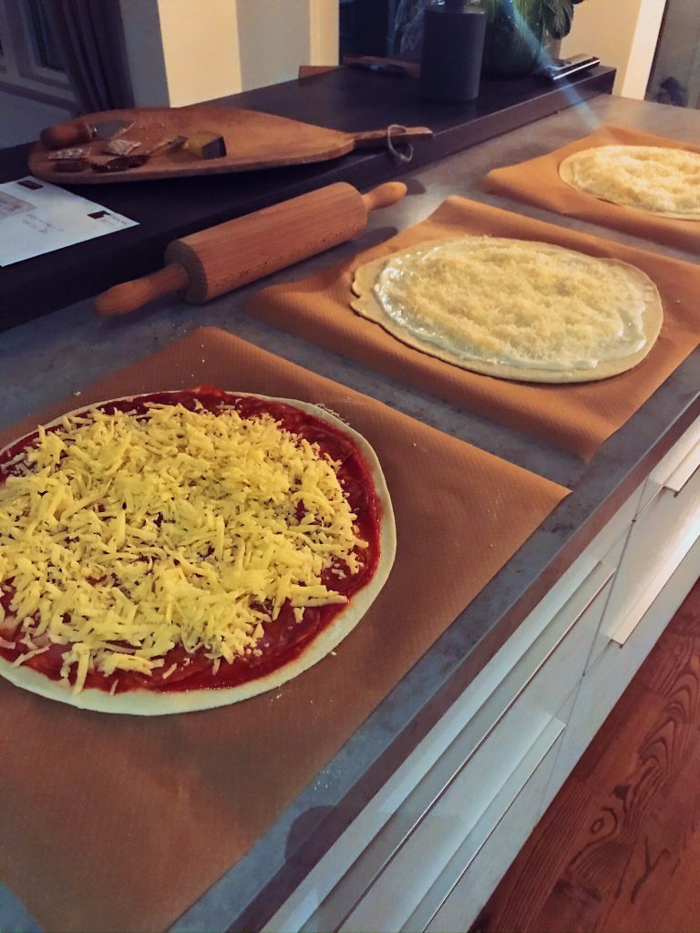 Lisa hjälpte till med pizzor och dessutom hade jag bett Mr T köpa med sig färdig pizzadeg från pizzerian på väg hem från kontoret. Blir riktigt bra pizzor på dem!