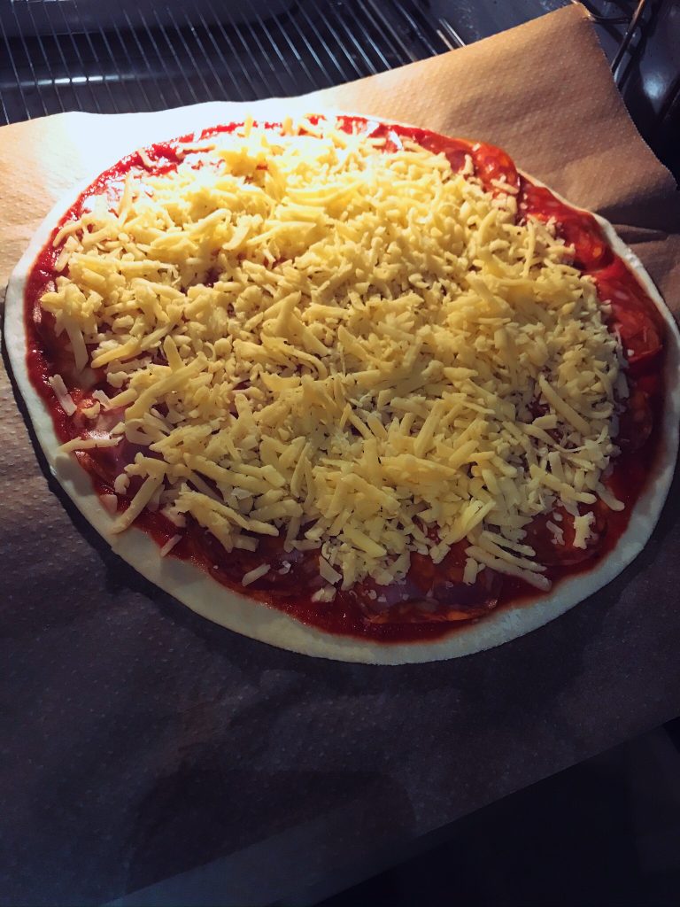 Variant nummer 1 var beställd av Hugo. Den bottnades med färdigköpt pizzasås från Ica som var riktigt, riktigt god! Sedan pusslade jag hela pizzabotten med chorizosalami. Alltså på riktigt pusslade. Den var totalt täckt av salami på hela botten. Sedan ost. Strössla över lite pizzakrydda eller oregano på toppen om du vill.