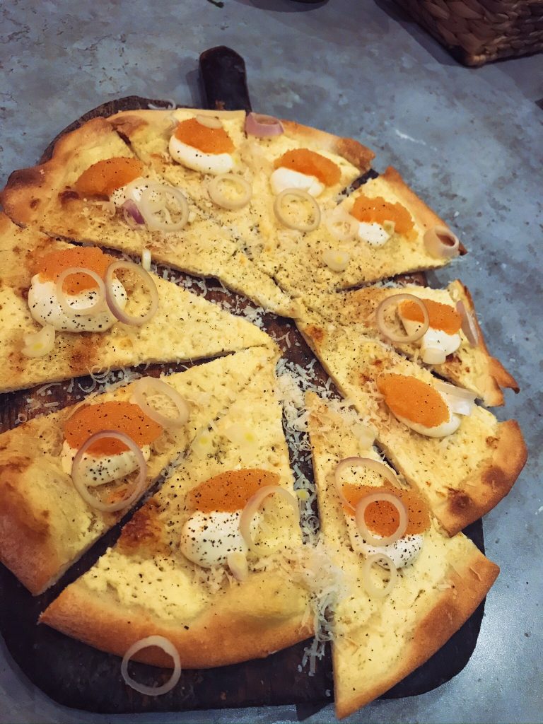 Sista varianten gick inte av för hackor heller… En löjromspizza. Jag valde för enkelhetens skull att göra grundfyllningen exakt samma som på Cacio e pepe, dvs crème fraîche och parmesanost med lite pecorino.